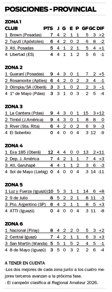 En la Zona 6, en tanto, 8 de Mayo de Iguazú y San Martín Wanda igualaron 0-0 y el resultado no ayudó a ni uno, pues ambos necesitaban el triunfo para meterle presión a los de arriba en la lucha por la clasificación.