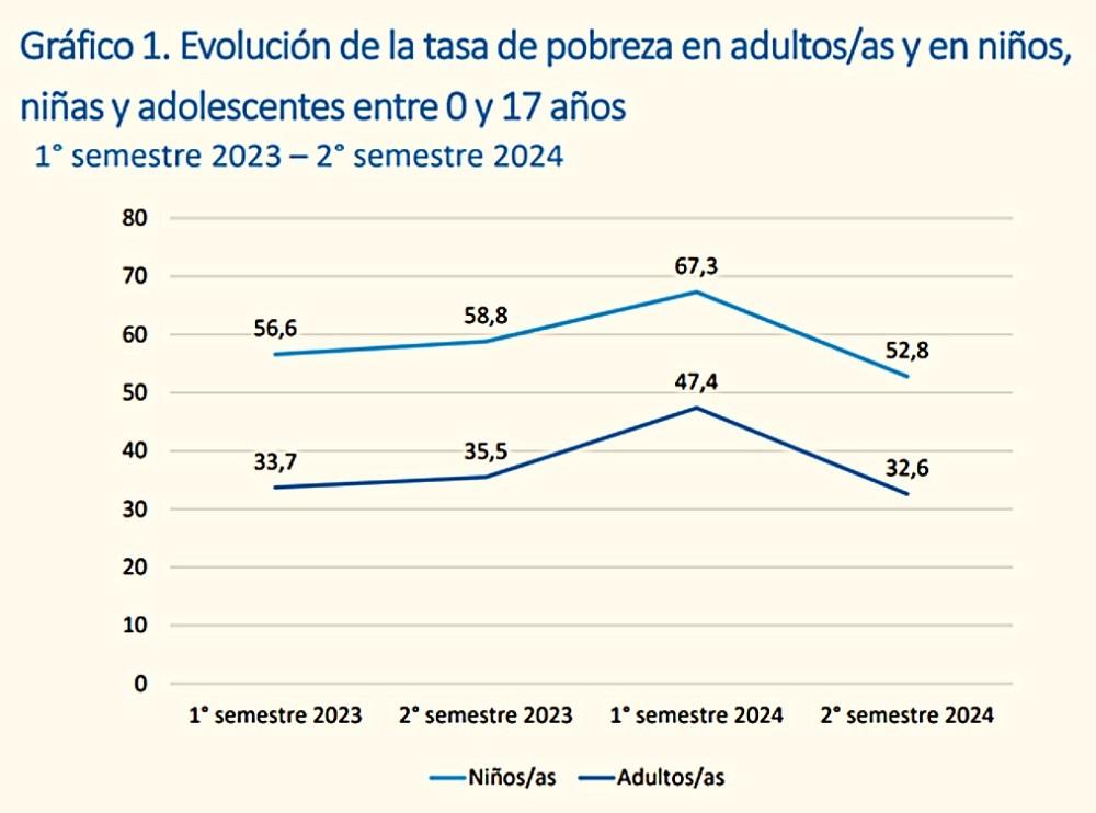 Aunque en el segundo semestre de 2024 el índice descendió al 52,8%, la mejora fue parcial y no alcanzó a todos los sectores del país. La pobreza infantil sigue siendo la más alta entre los grupos etarios, reflejando una estructura social profundamente desigual.
