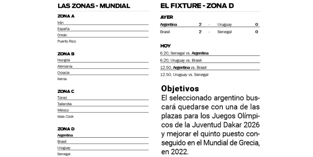 Argentina arrancó con el pie derecho su participación en el Mundial de la categoría y hoy buscará seguir en la buena racha cuando se mida con Senegal desde las 6.20 (hora argentina) y luego jugará ante Brasil, a partir de las 12.50. Todos duelos correspondientes a la Zona D.