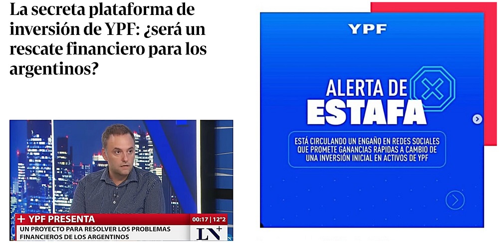 “El Gobierno argentino, en alianza con YPF, presenta una nueva oportunidad para los residentes argentinos” o “YPF apoyará a cada ciudadano de Argentina y pagará desde 900 mil pesos mensuales”, son las frases de los timadores en redes sociales. La suplantación de identidad para sustraer datos fue denunciada por el portal especializado “Chequeado” que resumió: “Los posteos virales no redirigen a los sitios periodísticos, sino que se tratan de páginas web falsas que imitan la estética del medio”.