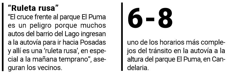 Vecinos pertenecientes a diferentes barrios de Candelaria, preocupados por los reiterados accidentes viales que se vienen registrando sobre la ruta nacional 12 a la altura del Parque Ecológico El Puma, reclamaron la intervención de las autoridades provinciales con el propósito de obtener mayor seguridad en el tránsito en ese punto neurálgico de la autovía donde se suman numerosos vehículos desde los barrios laterales. Cartelería, reductores de velocidad, “avisador” de cruce, son solamente algunas de las alternativas que sugieren los vecinos.
