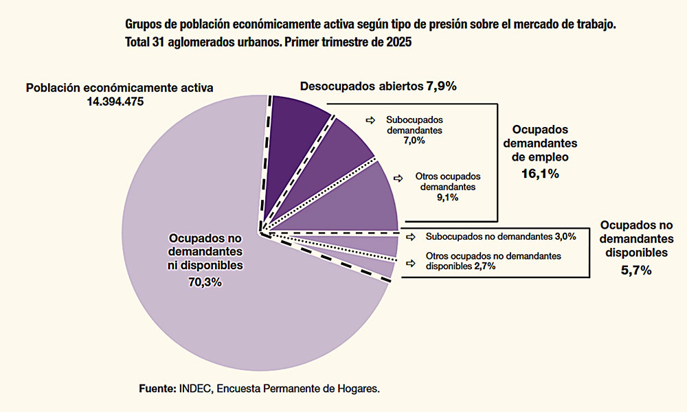 “La tasa de subocupación resultó del 10,0% de la Población económicamente activa (PEA), mientras que los otros ocupados demandantes y los otros ocupados no demandantes disponibles alcanzaron, en conjunto, el 11,8% de la PEA. Consecuentemente, la presión sobre el mercado laboral, conformada por el universo de desocupados, subocupados, ocupados demandantes y ocupados no demandantes disponibles, alcanzó el 29,7% de la PEA”.