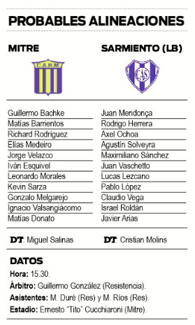 Motivado por el resultado de su última presentación y con la buena noticia de haber recuperado varias fichas importantes, Bartolomé Mitre se prepara para afrontar un duro compromiso hoy, por la fecha 15 del Torneo Federal A. El combinado de la Tierra Colorada se medirá con Sarmiento de La Banda, el solitario líder de la Zona D.