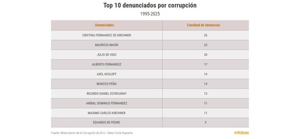 Cristina Kirchner es la funcionaria con más denuncias, acumulando 26 expedientes en su contra. Entre las causas más relevantes figuran Hotesur-Los Sauces, los “cuadernos de las coimas”, el Pacto con Irán y la “ruta del dinero K”. Algunas de estas causas ya fueron elevadas a juicio oral, mientras que otras siguen en etapa de investigación o apelación.