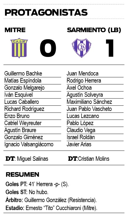 Bartolomé Mitre y Sarmiento de La Banda (Santiago del Estero) completaron este lunes los 40 minutos restantes del choque del domingo suspendido por lluvia y, para mala suerte de los misioneros, el tiempo no alcanzó para cambiar el rumbo y cayeron por 1-0, por la fecha 15 del Torneo Federal A.