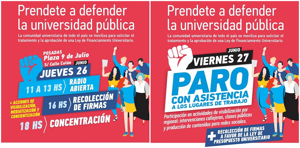 En un contexto de fuerte ajuste presupuestario y creciente conflicto en el sistema universitario, gremios docentes y organizaciones estudiantiles convocan a dos jornadas de protesta y visibilización en defensa de la universidad pública, que se realizarán en Posadas los días jueves 26 y viernes 27 de junio.Las actividades incluyen radio abierta, recolección de firmas, clases públicas y un paro docente con asistencia a los lugares de trabajo, en el marco de un plan nacional de lucha impulsado por la CONADU Histórica.