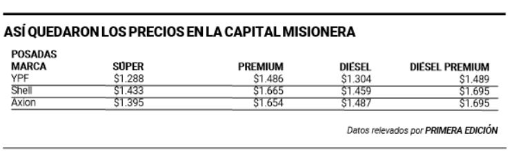 Mientras que Axion se sumó 24 horas después: en estaciones céntricas de la capital misionera, la Súper cuesta $1.395, la Quantium $1.654, el gasoil económico $1.487 y la versión premium $1.695.