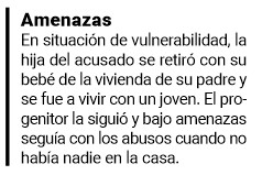 Como no lo logró, mantuvo bajo amenazas a su hija para que no revelara quién era el padre del bebé. El hombre le aseguraba que iba golpearla si lo contaba. Al lograr mantener el silencio y el sometimiento de su hija, esperaba que el joven mayor de edad no estuviera en la casa (por ejemplo cuando iba a trabajar) y la volvía a acceder carnalmente.
