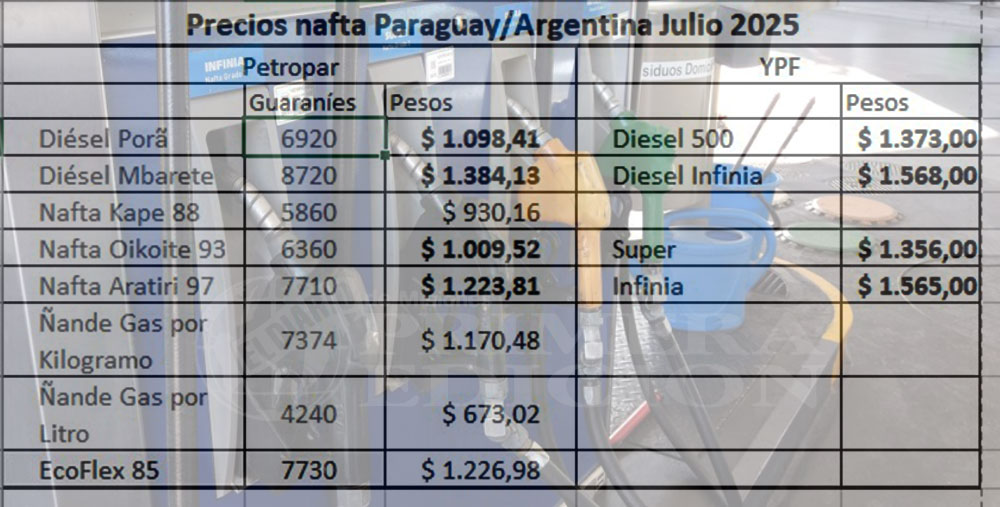 En el vecino país, la nafta súper (nafta oikoite 93) cuesta $1.009,52 y la premium (aratiri 97) se paga $1.223,81. Entre los diesel, la equivalente a Diesel 500 (diesel porá) vale $1.098,41, y la diesel premium (diesel mbareté) cuesta $1.384,13. Todos son precios de la estatal Petropar.
