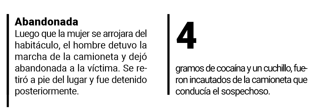 En ese lapso comenzó una discusión y el hombre se habría valido de la casi imposibilidad de escape ni pedido de auxilio de su ex, para comenzar a agredirla. Mientras el hombre manejaba con una mano, con la otra le propinaba golpes, los cuales la mujer hacía todo lo posible para cubrirse. Cuando ya no resistió más, abrió la puerta de la camioneta y se arrojó del habitáculo para caer luego entre la ruta y la banquina, a la altura de una zona conocida como “Eldoradito”.