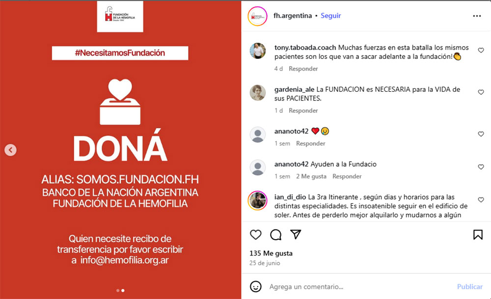 “Nos encontramos con la enorme limitación económica que nos trae la incertidumbre de si podremos continuar. Una de las importantes fuentes de financiación de esta organización es un aporte estatal, más precisamente del Ministerio de Salud de la Nación, que nos permite mantener el funcionamiento de la estructura de atención interdisciplinaria que todos conocemos, indispensable para el tratamiento de la hemofilia”, manifestaron sus integrantes.