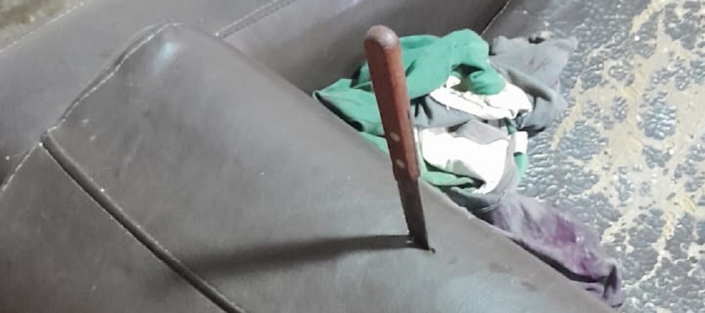 Tras esposar y trasladar al violento, dentro de la vivienda los policías hallaron incrustado en un sillón el cuchillo tipo tramontina, con el que habría sido amenazada la víctima minutos antes.
