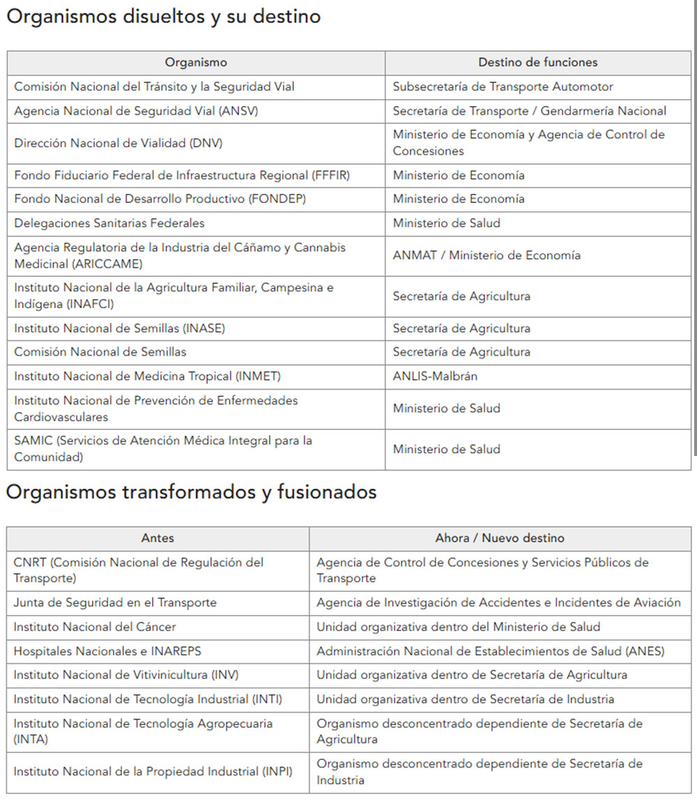 Entre los organismos disueltos se encuentran la Comisión Nacional del Tránsito y la Seguridad Vial, la Agencia Nacional de Seguridad Vial (ANSV), la Dirección Nacional de Vialidad, el Fondo Fiduciario Federal de Infraestructura Regional, el fideicomiso FONDEP, las Delegaciones Sanitarias Federales del Ministerio de Salud, la Agencia Regulatoria de la Industria del Cáñamo y del Cannabis Medicinal (ARICCAME), el Instituto Nacional de la Agricultura Familiar, Campesina e Indígena (INAFCI), el Instituto Nacional de Semillas (INASE) y la Comisión Nacional de Semillas, entre otros. En algunos casos, como el del Instituto Nacional de Medicina Tropical, se justificó la eliminación por superposición de funciones y falta de resultados concretos.