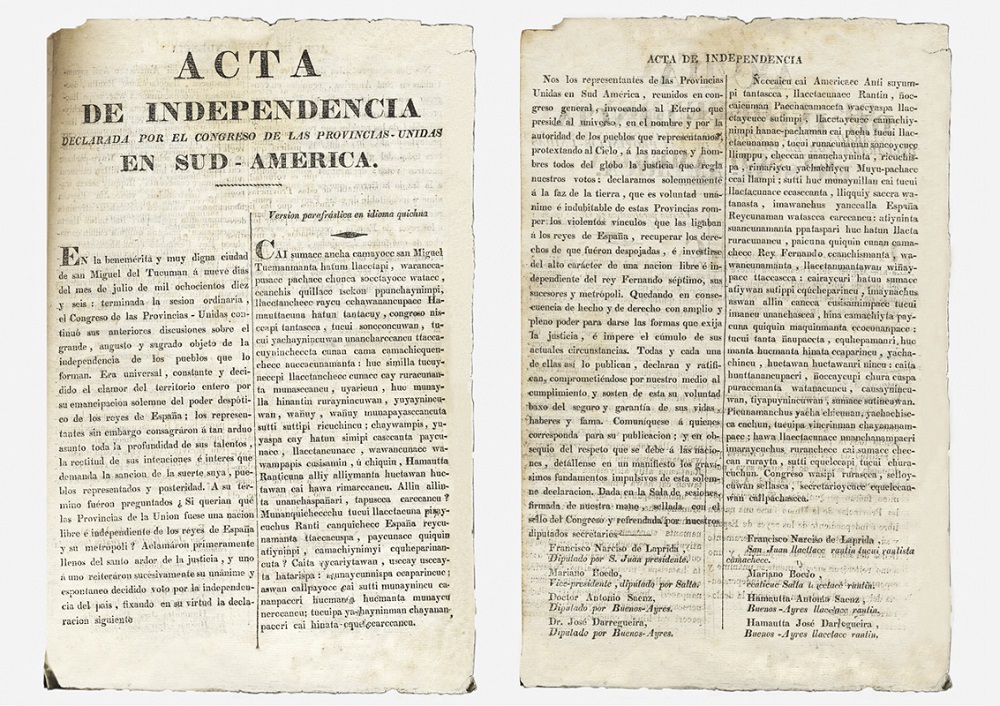 En medio de los gritos y vivas de la gente, los representantes fueron firmando el Acta de Independencia. “Es voluntad unánime e indubitable de estas Provincias, romper los violentos vínculos que los ligaban a los reyes de España, recuperar los derechos de que fueron despojados, e investirse del alto carácter de una nación libre e independiente del rey Fernando séptimo, sus sucesores y metrópoli”, dice un fragmento del acta, al que el 21 de julio se le añadió “y toda otra dominación extranjera”.