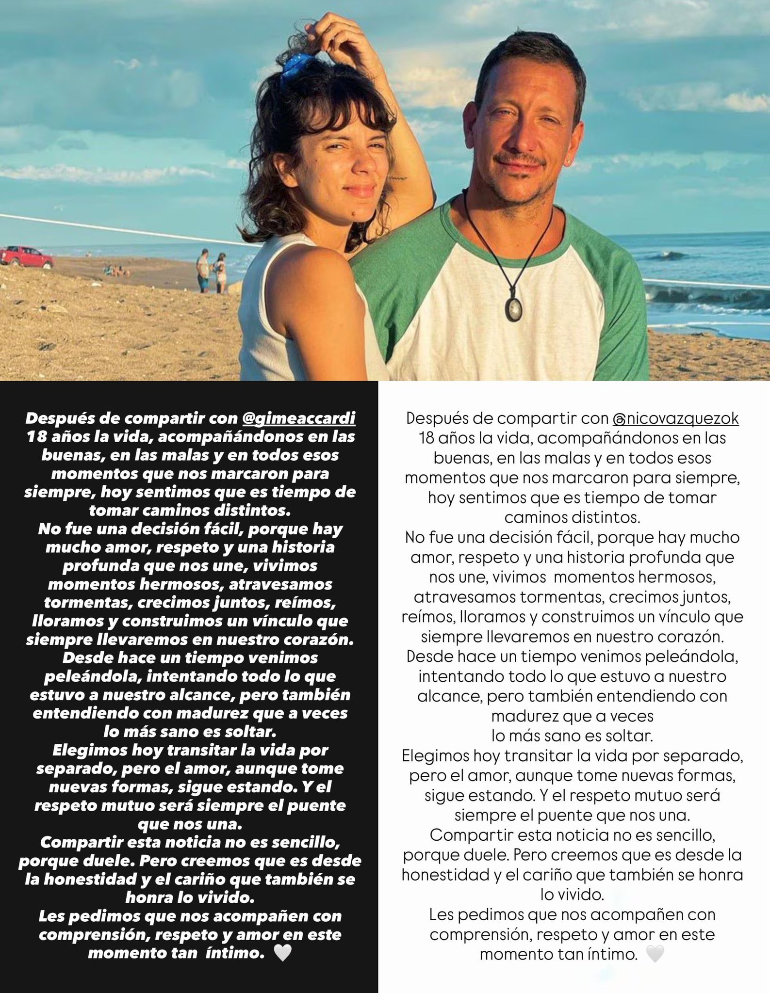 “Después de compartir con Gime Accardi 18 años la vida, acompañándonos en las buenas, en las malas y en todos esos momentos que nos marcaron para siempre, hoy sentimos que es tiempo de tomar caminos distintos”, escribió el protagonista de Rocky, la obra teatral que encabeza actualmente.