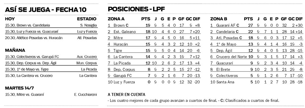 Y será un capítulo especial ya que se jugarán los interzonales, la esperada fecha de clásicos. Hoy, se desarrollarán tres encuentros: Brown recibirá a Candelaria y Luz y Fuerza se medirá con Guacurarí, ambos a las 15.30. En tanto que, a las 20.30, Atlético Posadas chocará con Huracán.
