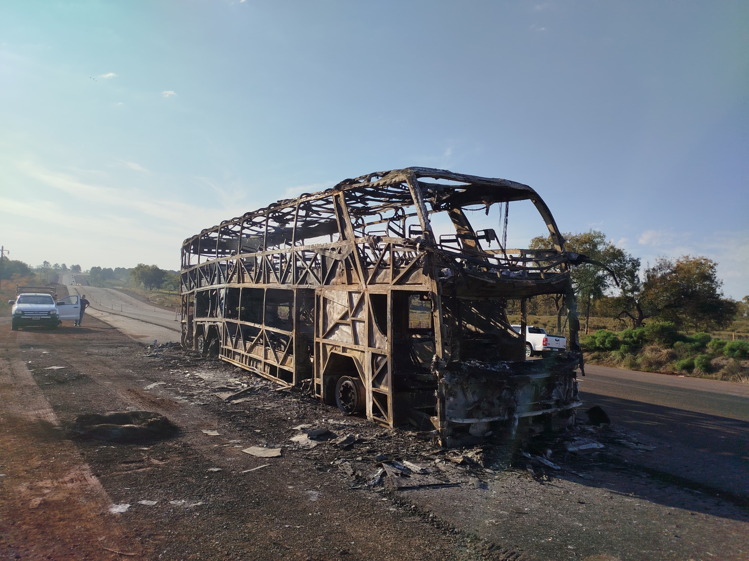 La estructura calcinada de un colectivo de la empresa Crucero del Norte sobre la Ruta Nacional 105, en San José, es el impactante resultado del incendio que se desató este sábado por la tarde. La unidad, que no transportaba pasajeros, terminó completamente consumida por el fuego, aunque afortunadamente no hubo heridos.