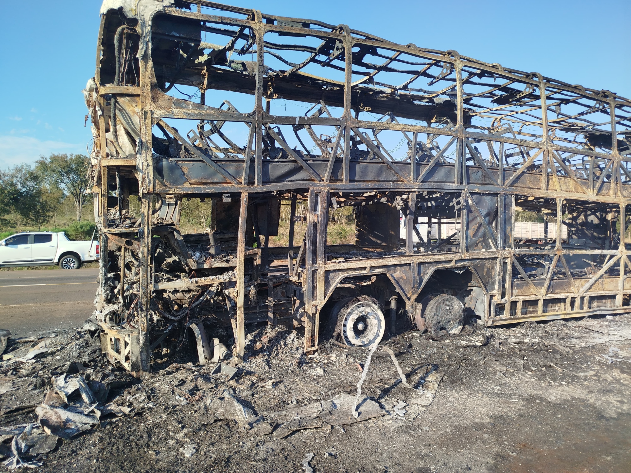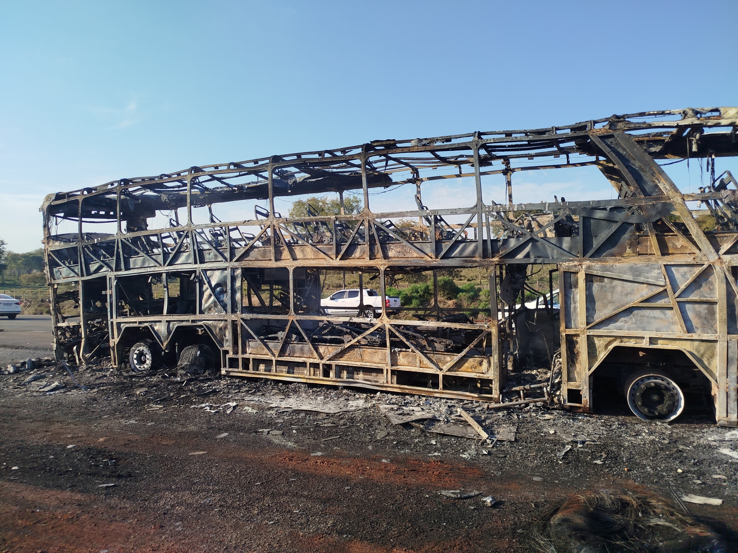 . La fotografía tomada luego del siniestro muestra los restos carbonizados del colectivo: sin cristales, sin asientos, con la carrocería reducida a una estructura metálica retorcida.