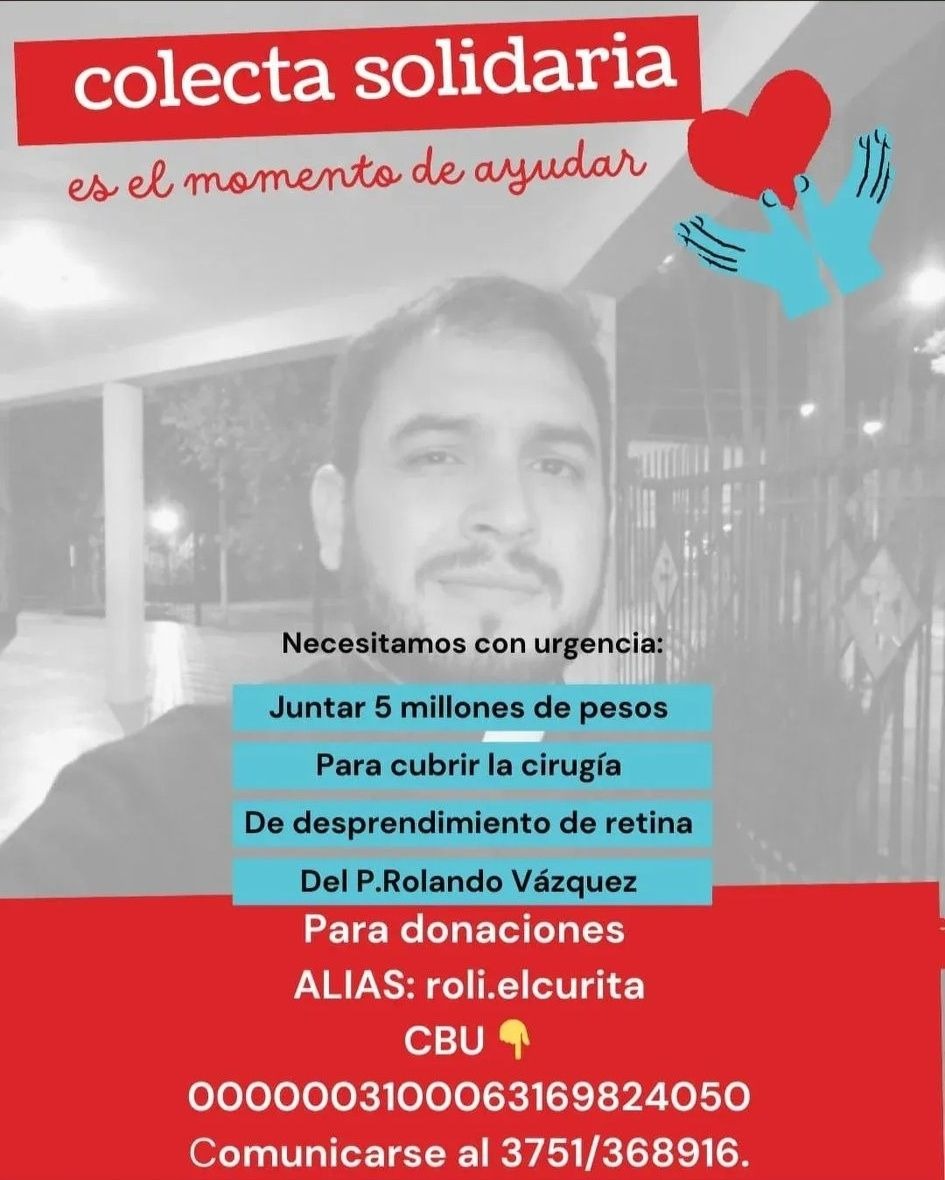 El sacerdote Rolando Vázquez, de la diócesis de Iguazú y oriundo de la localidad de 9 de Julio, enfrenta una delicada situación de salud tras sufrir un derrame ocular que derivó en un desprendimiento de retina