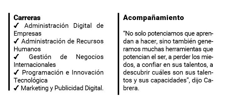 Sostuvo que los preparan “con mucha tendencia en cuanto a herramientas de tecnología para que, justamente, sean profesionales de calidad y que lleven conocimiento de todas estas herramientas tecnológicas al lugar al que vayan a apostar con sus proyectos. Los formamos para que sean emprendedores y empresarios del futuro. Terminan todos con una carrera y un negocio que se potencia dentro de las aulas para que se animen a emprender”.
