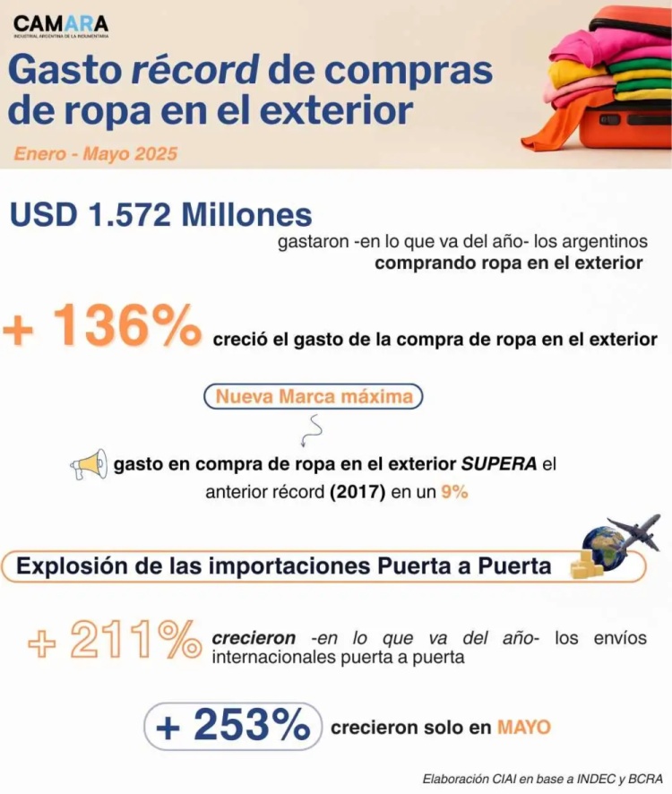 De acuerdo a un informe de la Cámara Industrial Argentina de la Indumentaria (CIAI), en base a datos del INDEC y el BCRA, entre enero y mayo del 2025 hubo un “gasto récord de compras de ropa en el exterior”.