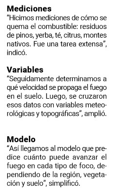 Luego, se cruzaron esos datos con variables meteorológicas y topográficas: velocidad y orientación del viento, humedad ambiental, cantidad de días desde la última lluvia, pendiente del terreno. “Así llegamos al modelo que predice cuánto puede avanzar el fuego en cada tipo de foco”.