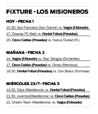 En cuanto a los dos representantes de la Asociación Posadeña de Fútbol de Salón (APoFuSa), el primero en salir hoy a la cancha será Dental Futsal, que desde las 17 se medirá con Cloacas FC de Itatí, Corrientes.