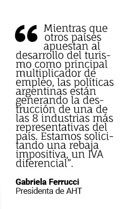 En este contexto, Gabriela Ferrucci, presidenta de AHT, dijo que se pierden 10 empleos por día y explicó: “Mientras que otros países apuestan al desarrollo del turismo como principal multiplicador de empleo, las políticas argentinas están generando la destrucción de una de las 8 industrias más representativas del país. Estamos solicitando una rebaja impositiva, específicamente apuntando a un IVA diferencial”.