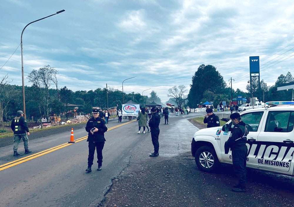 Personal de Gendarmería Nacional colaboró en el operativo, mientras que la Policía de Misiones realizó tareas preventivas y organizó desvíos para garantizar la seguridad de los manifestantes y de quienes circulaban por la zona.