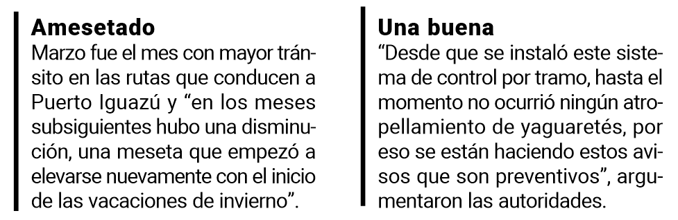 El atropellamiento de la fauna silvestre en la zona del Parque Nacional Iguazú y el Parque Provincial Puerto Península, es uno de los mayores problemas que enfrenta la provincia en los últimos años y como medida para evitar que eso siga creciendo se instalaron radares con el propósito de controlar la velocidad por tramos sobre las rutas 12 y 101, respectivamente.
