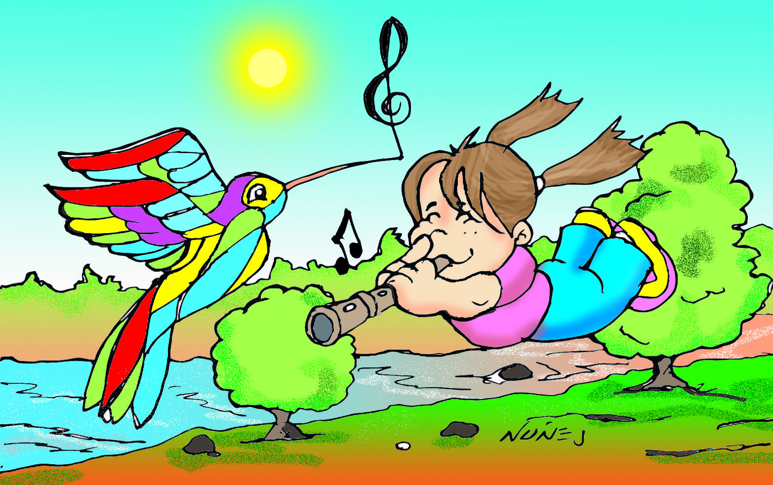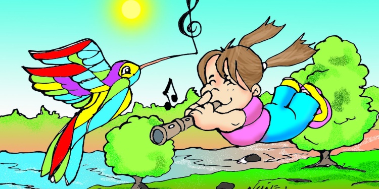 Una mañana, mientras tocaba su flauta bajo su árbol favorito, apareció un colibrí azul con una pequeña partitura dorada en el pico. La nota final de esa partitura… ¡era una Nota Sol que brillaba como el sol al amanecer!