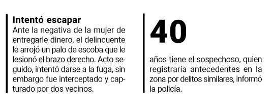 Entonces el delincuente le arrojó un palo de escoba, que le dio de lleno en el brazo derecho y que le dejó un hematoma, expresó la damnificada.