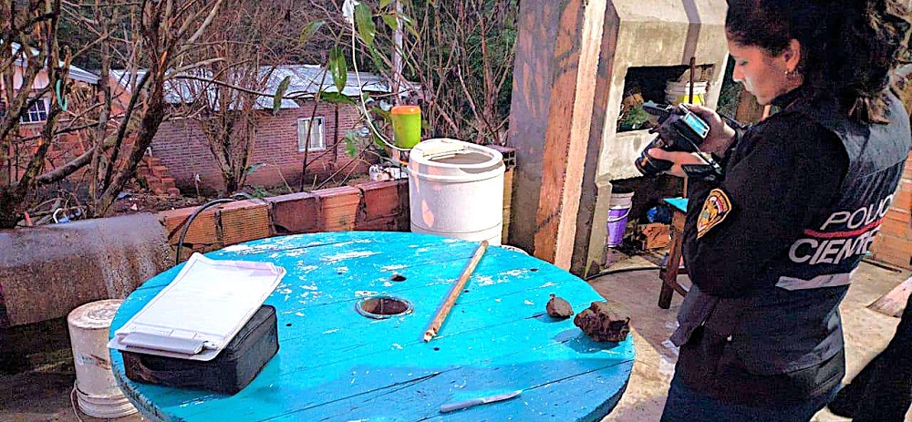 PERICIAS. Una agente analiza y registra las evidencias en la escena del fallido asalto, entre ellas el palo de escoba.