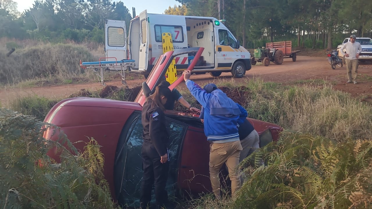 Uno de los incidentes tuvo lugar en un camino vecinal del paraje Once Vueltas, en el municipio de Gobernador López, donde una mujer de 49 años perdió el control de su automóvil Fiat Siena y terminó volcando sobre una alcantarilla. El accidente se produjo cuando se dirigía hacia el casco urbano, por causas que aún se investigan. La conductora fue trasladada al Hospital SAMIC de Leandro N. Alem, mientras efectivos de Bomberos, la Comisaría local y la División Policía Científica trabajaron en la escena para determinar las circunstancias del despiste. Se aguarda el parte médico oficial.
