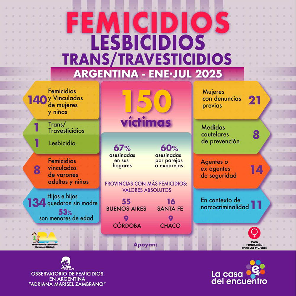 Entre el 1° de enero y el 31 de julio de 2025 se registraron 150 víctimas directas e indirectas de femicidios en la Argentina, según el último relevamiento del Observatorio de Femicidios “Adriana Marisel Zambrano” que dirige La Casa del Encuentro. El informe detalla 140 femicidios de mujeres y niñas, un lesbicidio, un transfemicidio y ocho femicidios vinculados de varones adultos y niños.
