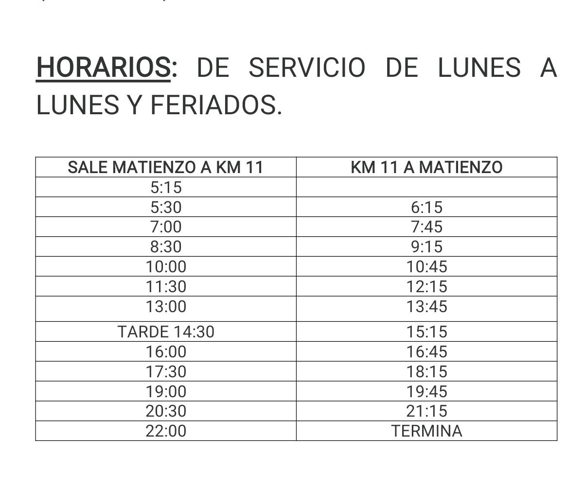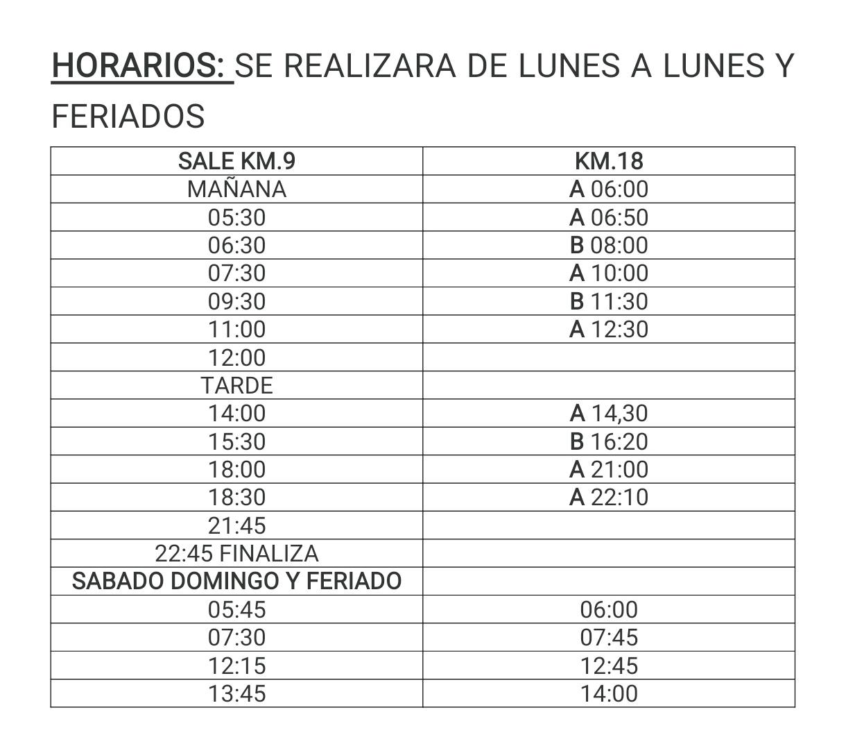 Los detalles incluyen rutas específicas, horarios de ida y vuelta, y días de servicio, incluyendo feriados.