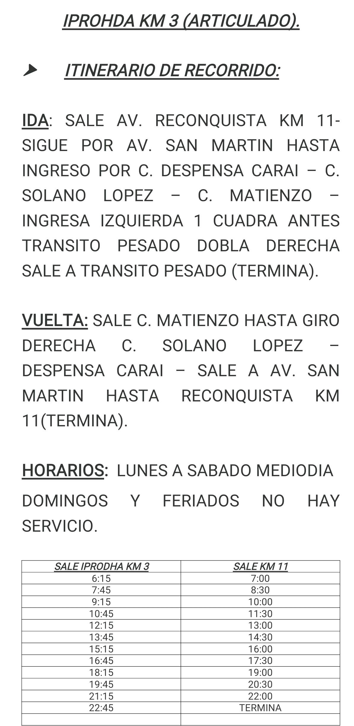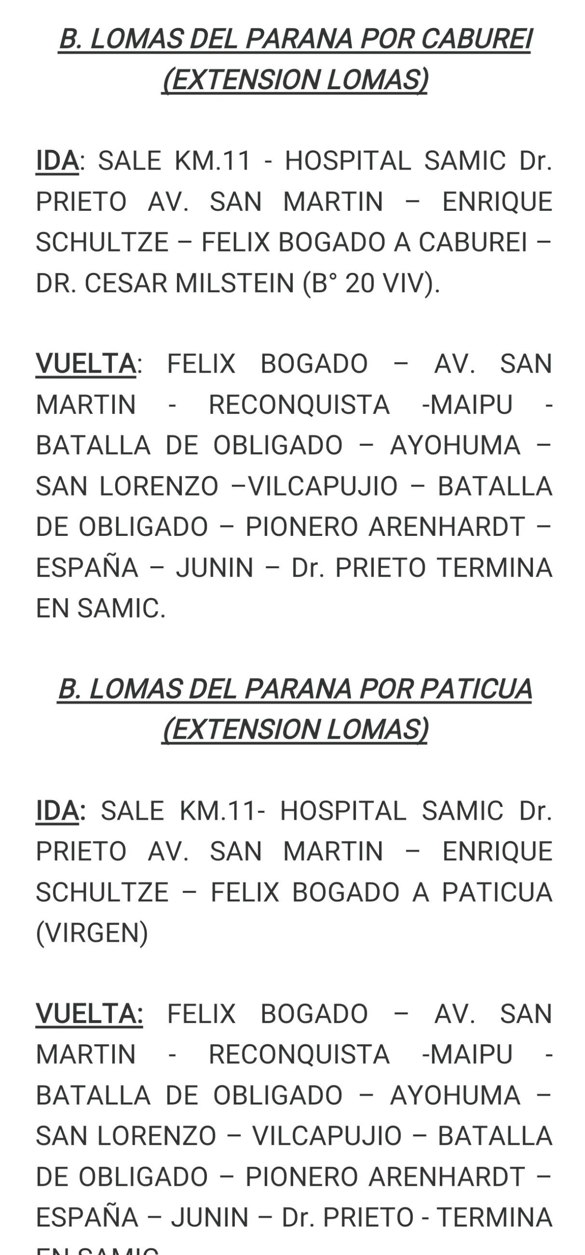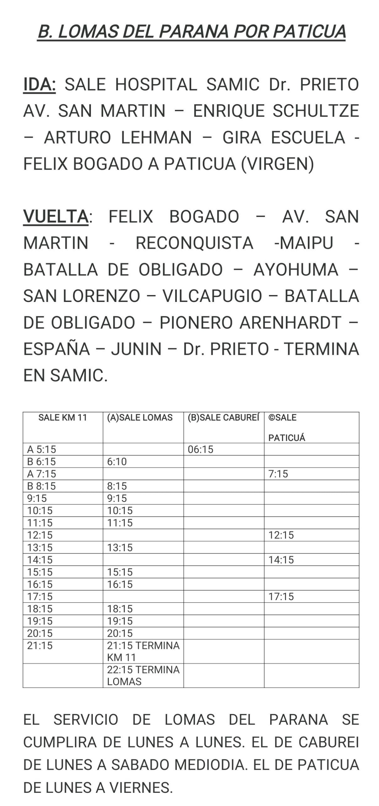 Por ejemplo, el recorrido de Lomas del Paraná por Paticuá ahora incluye horarios precisos de salida desde el hospital SAMIC hasta Félix Bogado, y la vuelta por Reconquista, Maipú y Batalla de Obligado, hasta culminar nuevamente en el hospital.