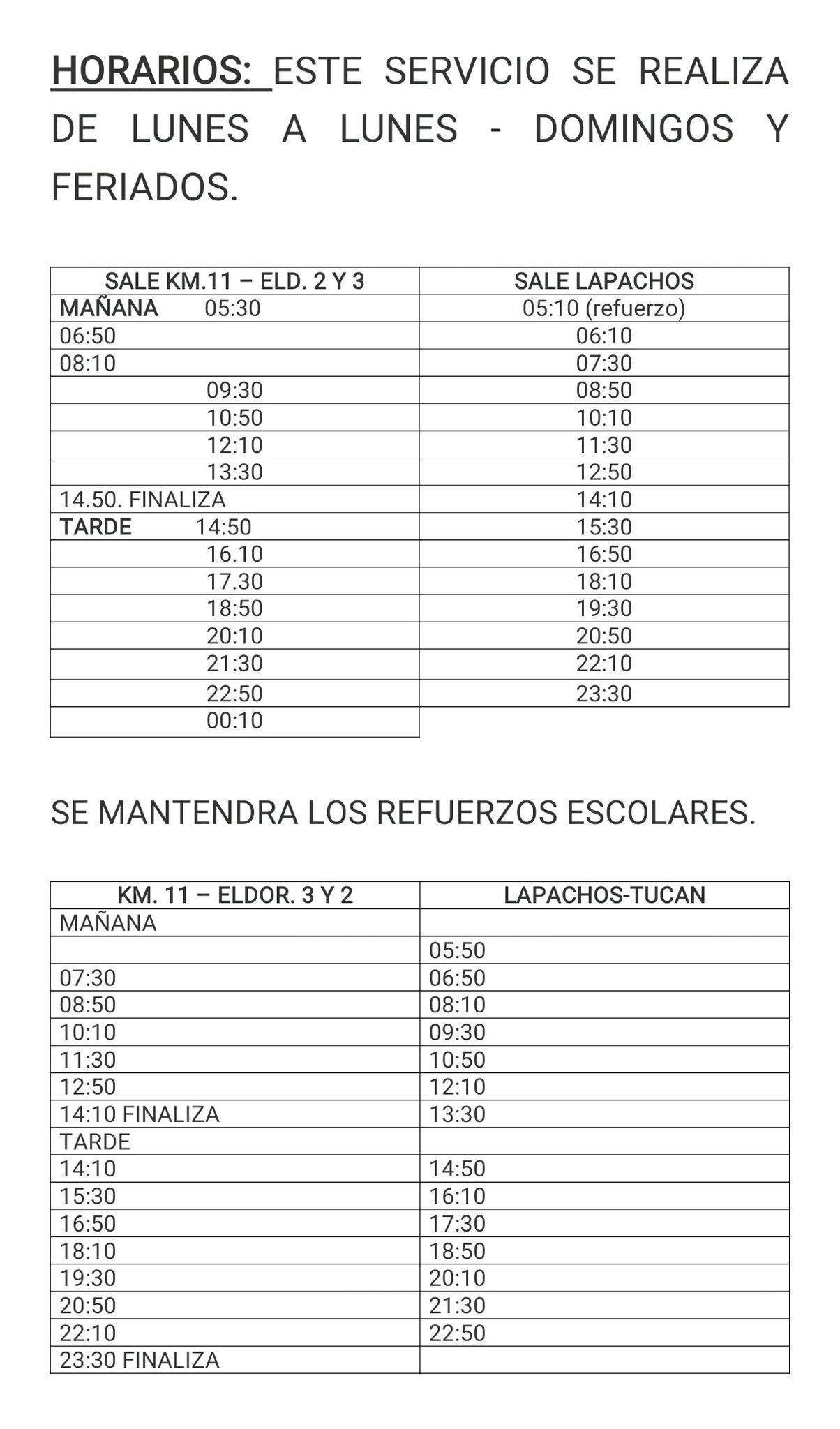 Lo mismo sucede con la línea que une los barrios Lapachos y Tucán, que ahora cuenta con salidas regulares desde las 5.10 hasta las 23.30, incluyendo refuerzos escolares.