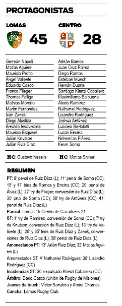 Ayer, Lomas comenzó corriendo de atrás, teniendo en cuenta que en los primeros minutos Centro lo sorprendió con un juego profundo, que lo llevó a marcar sus dos primeros tries, por intermedio de Ramos y Encina, con apenas dos minutos de diferencia (a los 15 y 17).