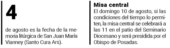 El domingo 10 de agosto, si las condiciones del tiempo lo permiten, la misa central se celebrará a las 11 en el patio del Seminario, presidida por el obispo de Posadas, Juan Rubén Martínez. Al finalizar la celebración eucarística, se realizará el almuerzo comunitario tradicional.