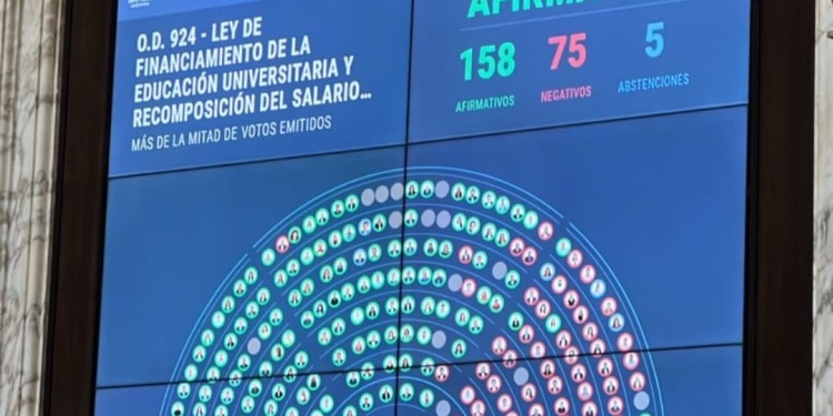 La Cámara de Diputados aprobó hoy en general el proyecto que otorga y actualiza fondos a las universidades nacionales por 158 votos afirmativos, 75 negativos y 5 abstenciones, y otorgó un duro golpe al gobierno de Javier Milei, que rechaza esa iniciativa.