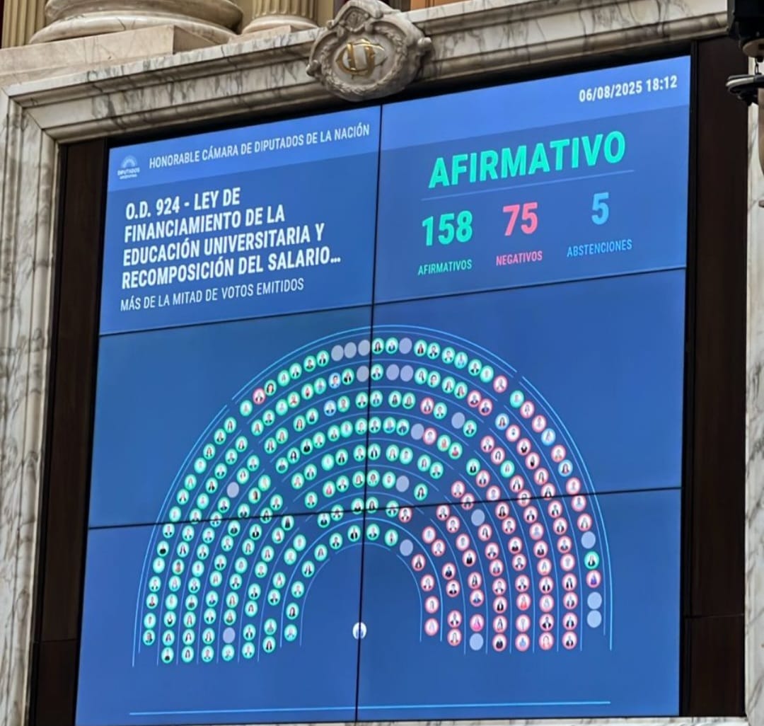 La Cámara de Diputados aprobó hoy en general el proyecto que otorga y actualiza fondos a las universidades nacionales por 158 votos afirmativos, 75 negativos y 5 abstenciones, y otorgó un duro golpe al gobierno de Javier Milei, que rechaza esa iniciativa.