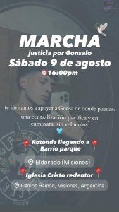 La caminata en Eldorado partirá desde la rotonda del kilómetro 11 hacia barrio Parque, mientras que en Campo Ramón comenzará en la iglesia Cristo Redentor, ambas a la misma hora. Los organizadores invitan a los participantes a llevar carteles con imágenes o frases en memoria de Gonzalo, aunque con solo su presencia será suficiente, enfatizando que todo se realizará con respeto y de manera pacífica.