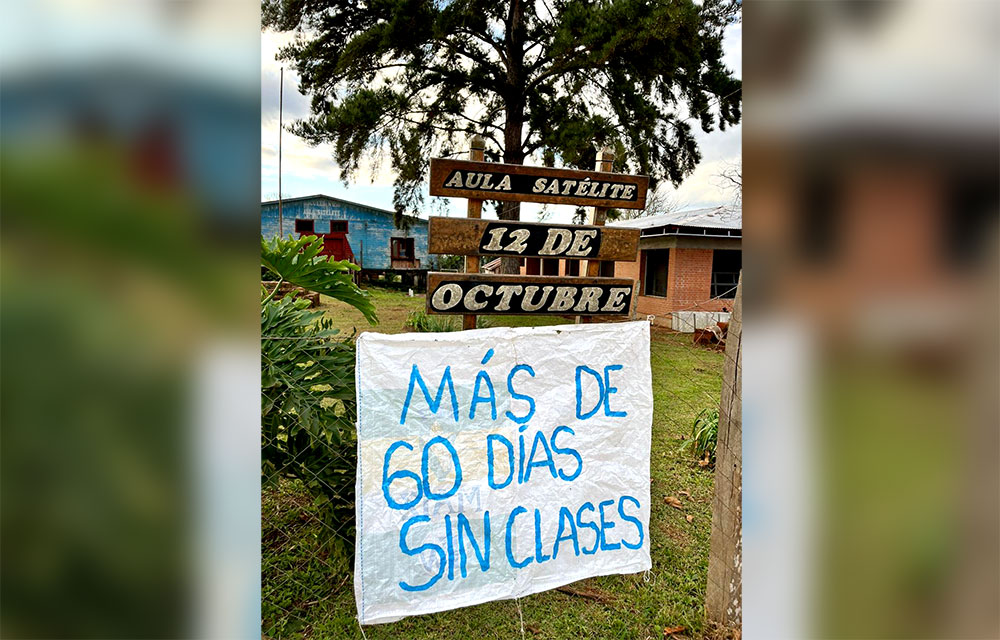 Hace tres meses, en plena clase, una tormenta rompió los vidrios y sacó las ventanas ubicadas en una de las paredes del viejo y precario edificio del aula satélite II de la Escuela 946, ubicado en el Paraje 12 de Octubre de Puerto Esperanza, dejando a los más de 60 alumnos de primaria y nivel inicial sin una escuela seca (el agua de la lluvia entra por los huecos que quedaron e inunda las aulas) y segura donde aprender cada día.