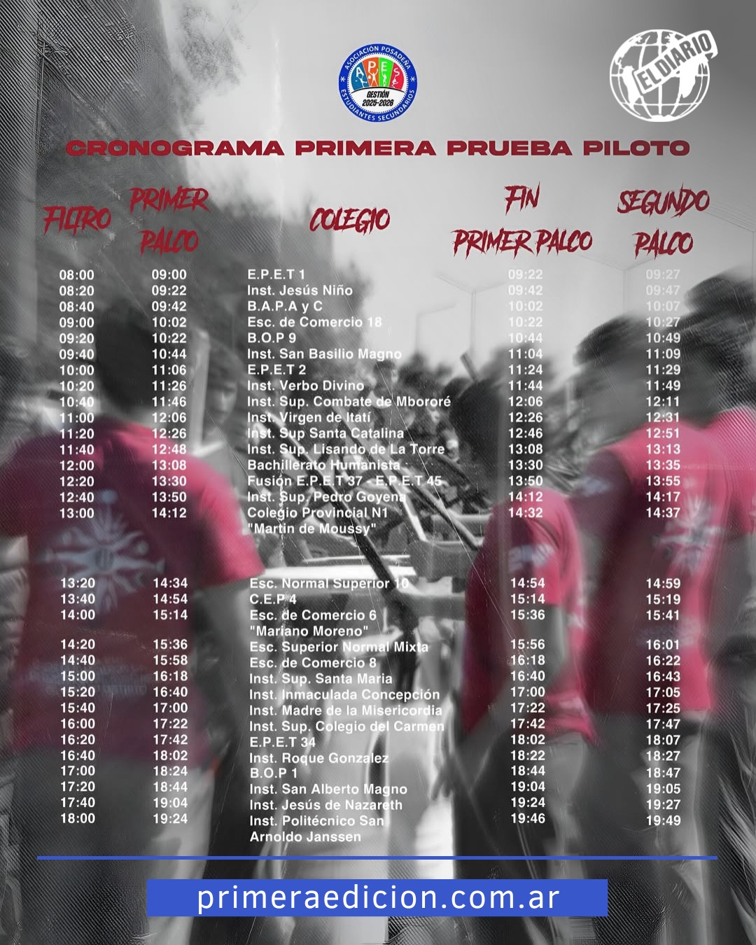 El próximo miércoles 13 de agosto, desde las 9 hasta las 21 horas, el cuarto tramo de la costanera será escenario de la Primera Prueba Piloto de la Estudiantina 2025. Durante las últimas horas, APES confirmó el cronograma de los colegios participantes, y en que horarios partirán y pasarán por los distintos palcos ubicados sobre la calzada. El encargado de abrir la jornada será la EPET Nº1 y el cierre estará a cargo del Instituto San Arnoldo Janssen.