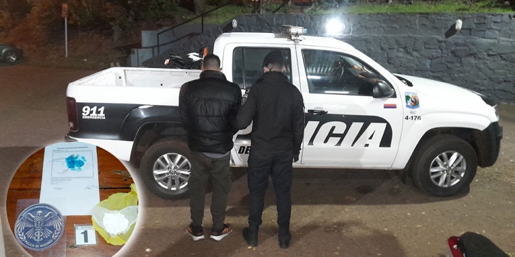Durante la identificación, los policías solicitaron al detenido que exhibiera un bulto que llevaba en el bolsillo de su campera. Se trataba de una bolsa plástica que contenía una sustancia polvorienta blanca.