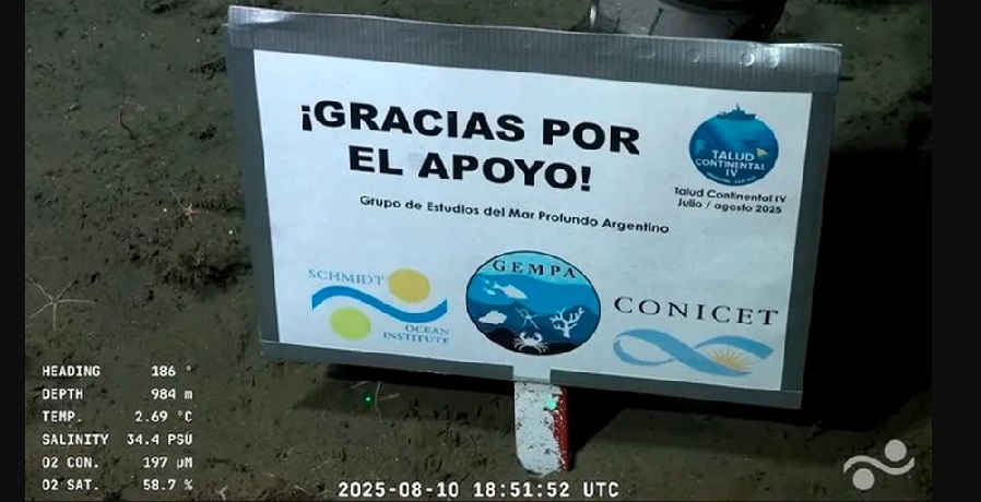 En la última inmersión del robot submarino, los científicos del Grupo de Estudios del Mar Profundo Argentino (GEMPA) desplegaron un cartel con un simple pero contundente mensaje que se viralizó en las redes: “Gracias por el apoyo”.