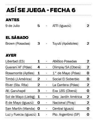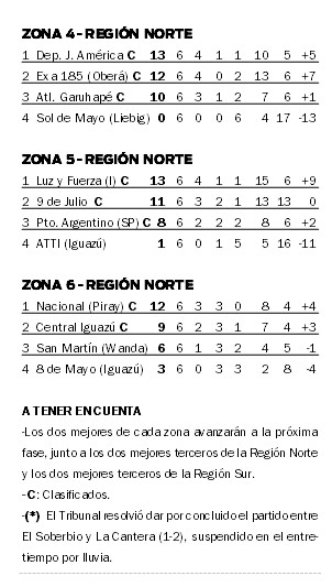 En la Zona 5, Luz y Fuerza terminó primero al derrotar por 1-0 a Puerto Argentino de San Pedro, al que de todos modos le alcanzó para pasar de instancia. Y finalmente, en la Zona 6, Nacional de Puerto Piray terminó en lo más alto tras superar por 2-0 en Iguazú a 8 de Mayo, mientras que el segundo boleto quedó en manos de Central Iguazú, que empató 0-0 con San Martín de Wanda.