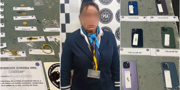 Una azafata de Aerolíneas Argentinas fue detenida en el Aeropuerto Internacional de Ezeiza por contrabandear dólares, relojes, celulares y joyas por $58 millones. Se supo que la acusada guardó los elementos en su equipaje de mano y bodega.