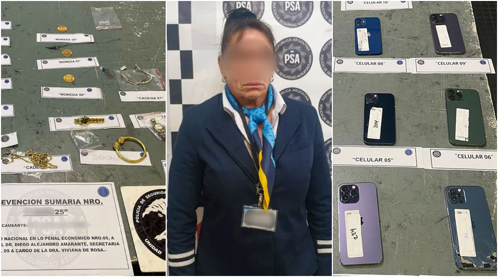 Una azafata de Aerolíneas Argentinas fue detenida en el Aeropuerto Internacional de Ezeiza por contrabandear dólares, relojes, celulares y joyas por $58 millones. Se supo que la acusada guardó los elementos en su equipaje de mano y bodega.